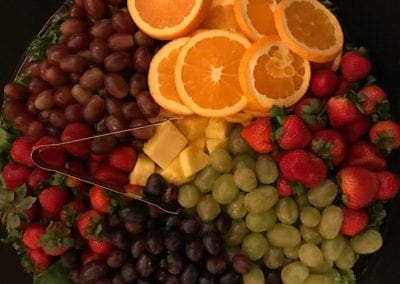 Assorted fruit, such as strawberries, grapes, pineapple, oranges, etc. We can also do a fruit tray with assorted melons.